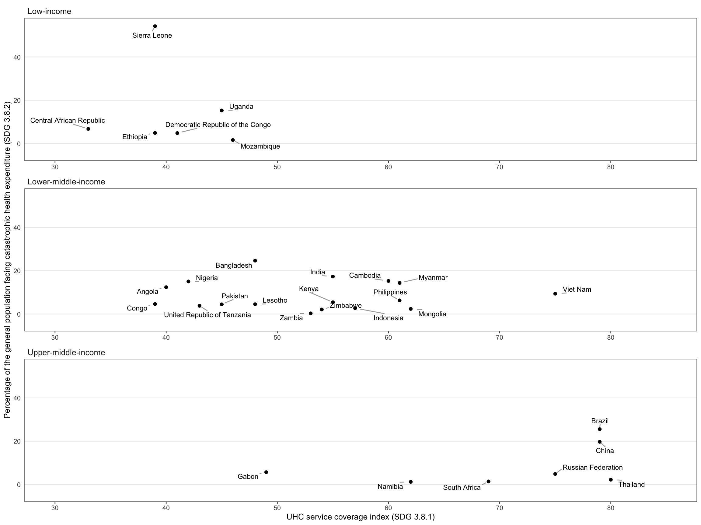 Fig. 6.1.4 UHC service coverage index (SDG 3.8.1)a and percentage of the general population facing catastrophic health expenditures (SDG 3.8.2),b 30 high TB burden countries and three global TB watchlist countries,c stratified by income groupd