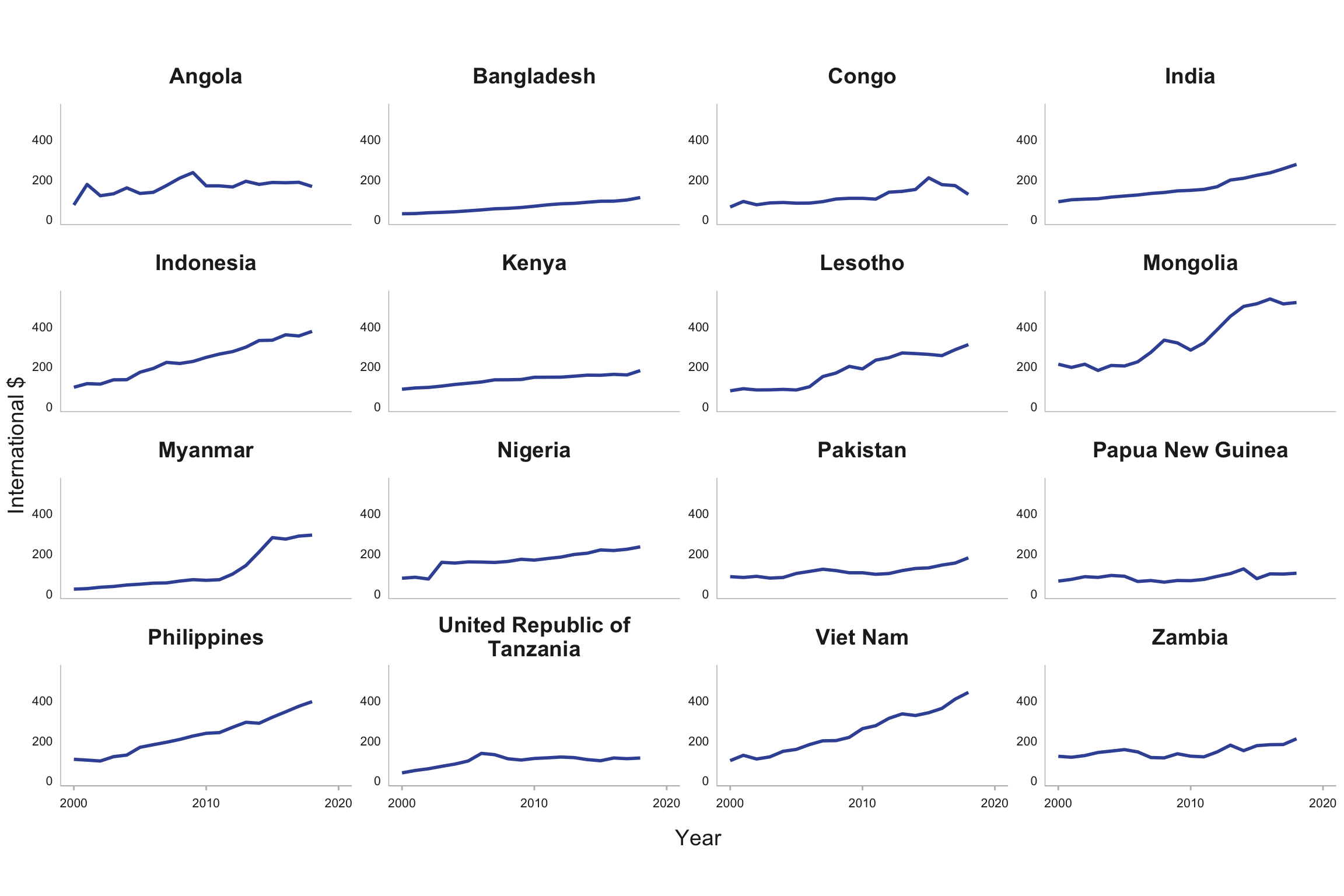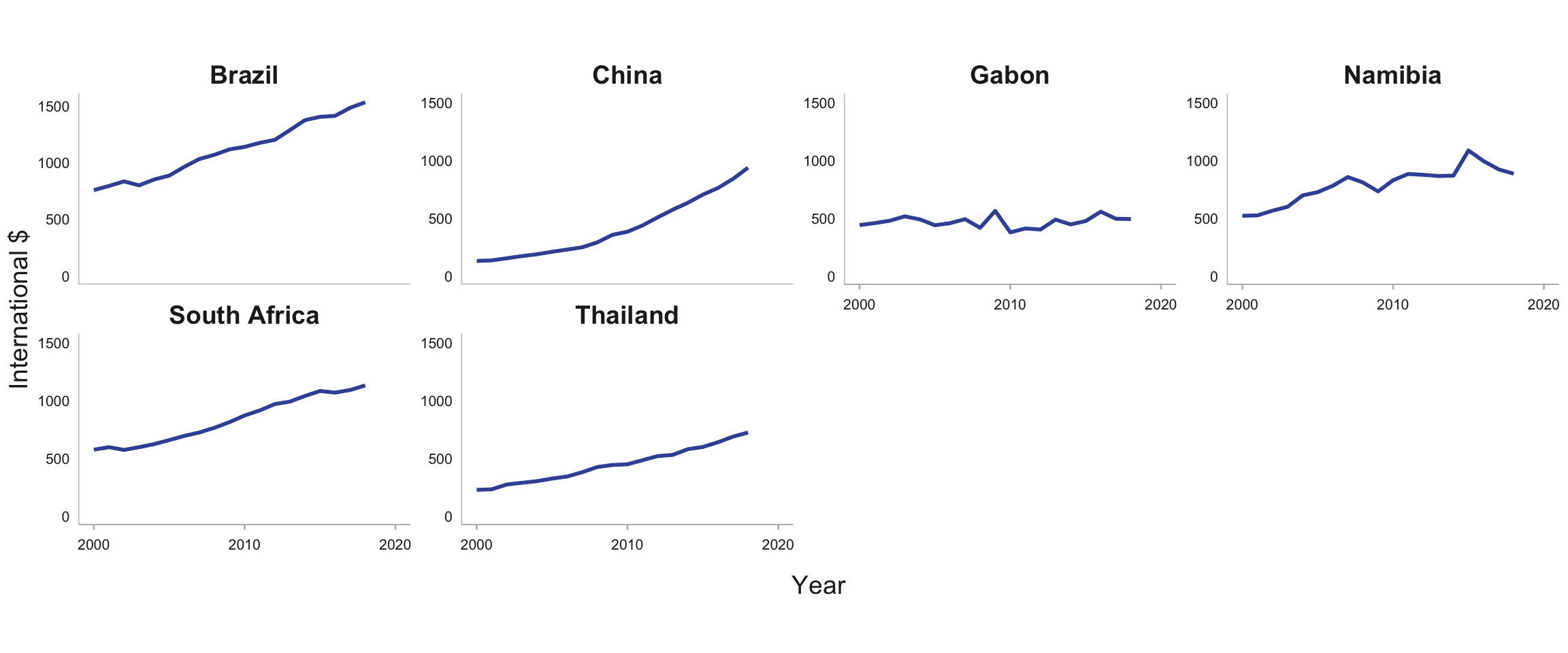 To achieve UHC, substantial increases in investment in health are critical. From 2000 to 2017 there was a striking increase in health expenditure (from all sources) per capita in a few high TB burden countries, especially the upper-middle-income countries of Brazil, China, South Africa and Thailand (Fig. 6.1.5). A steady upward trend was evident in India, Indonesia, Liberia, Mongolia, the Philippines and Viet Nam, and there was a noticeable rise from 2012 to 2017 in Myanmar. Elsewhere, however, levels of spending have been relatively stable, and at generally much lower levels.